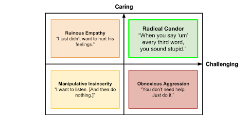 The two main components of radical candor are “caring personally” and “challenging directly.” This chart provides a handy way to conceive of the concept, mapping out three danger zones and the radical candor “sweet spot,” located in the upper-right-hand corner: